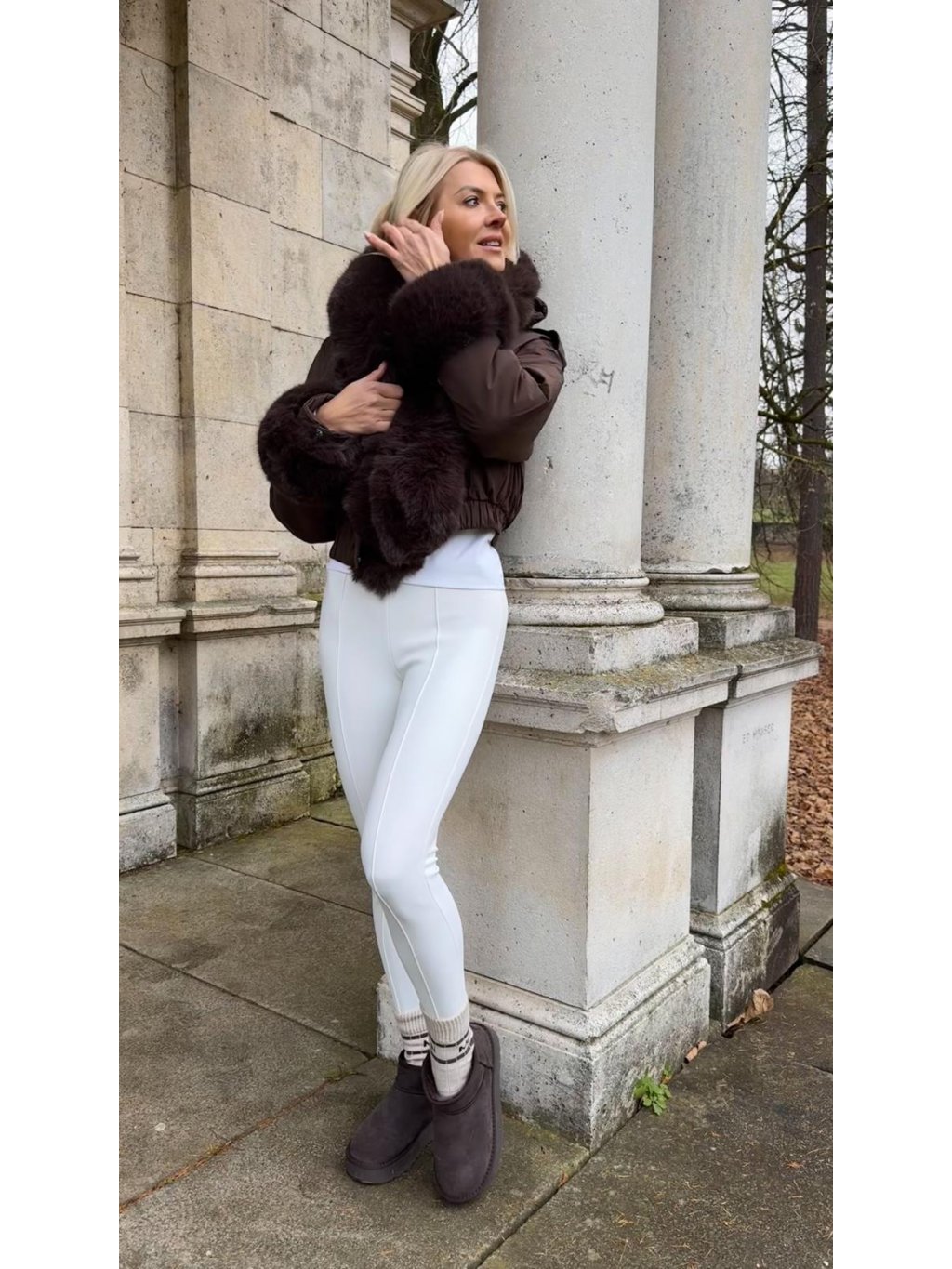 Bohatá huňatá kožušina v čokoládovej farbe lemuje kapucňu,rukávy,funkčné vrecká a zapínanie na zips.