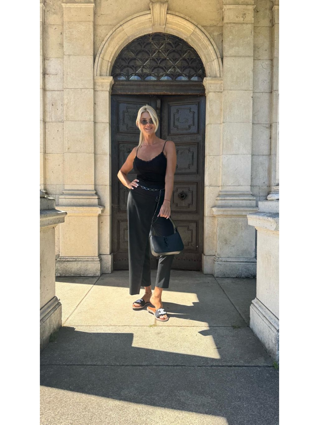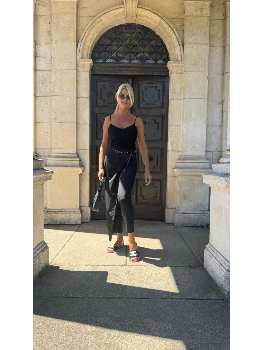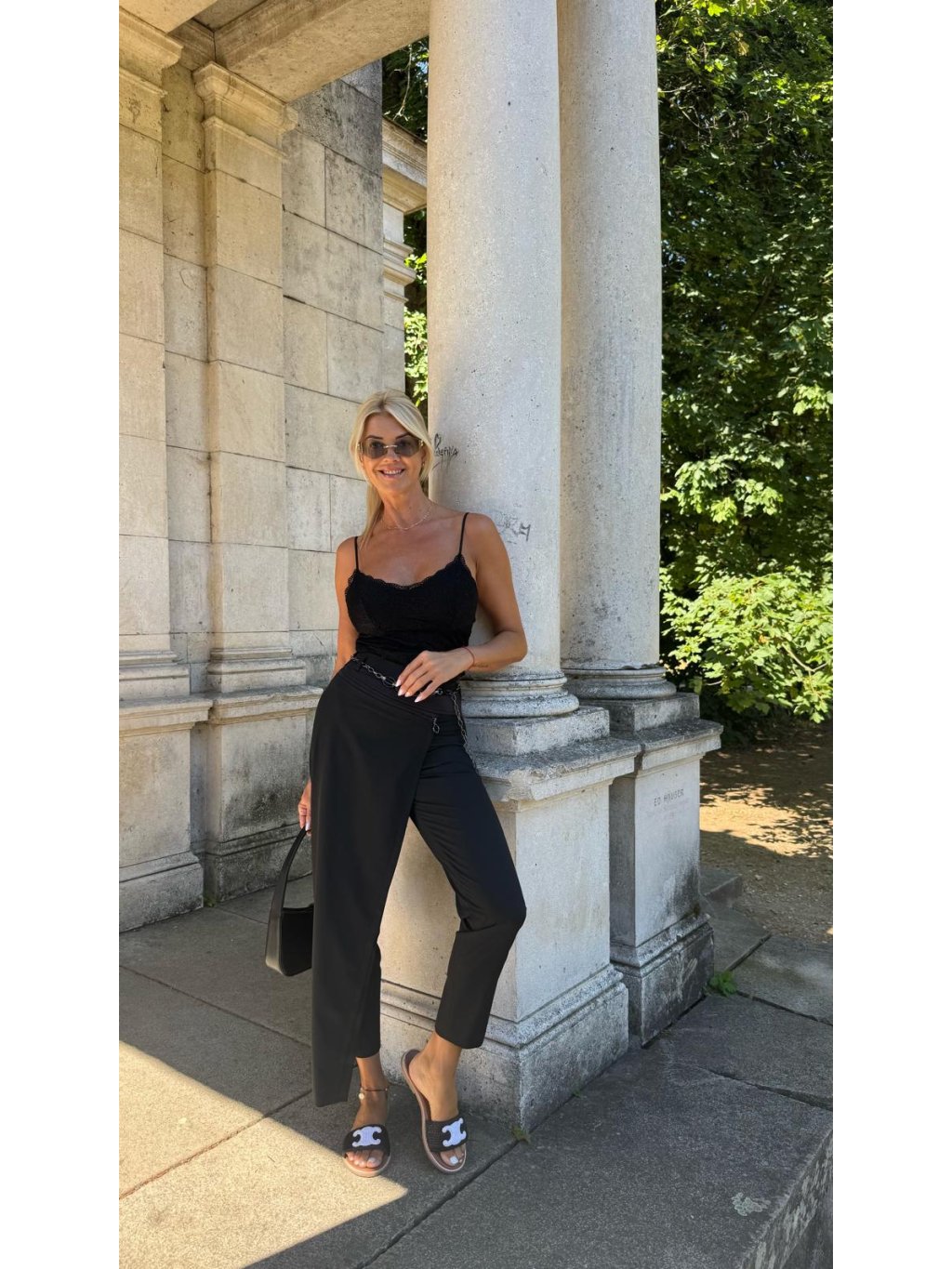 Volnejší strih nohavíc.Majú prekrížený predný diel,čo vytvára zaujmavý moderný efekt.,podobný zavinovacej sukni.