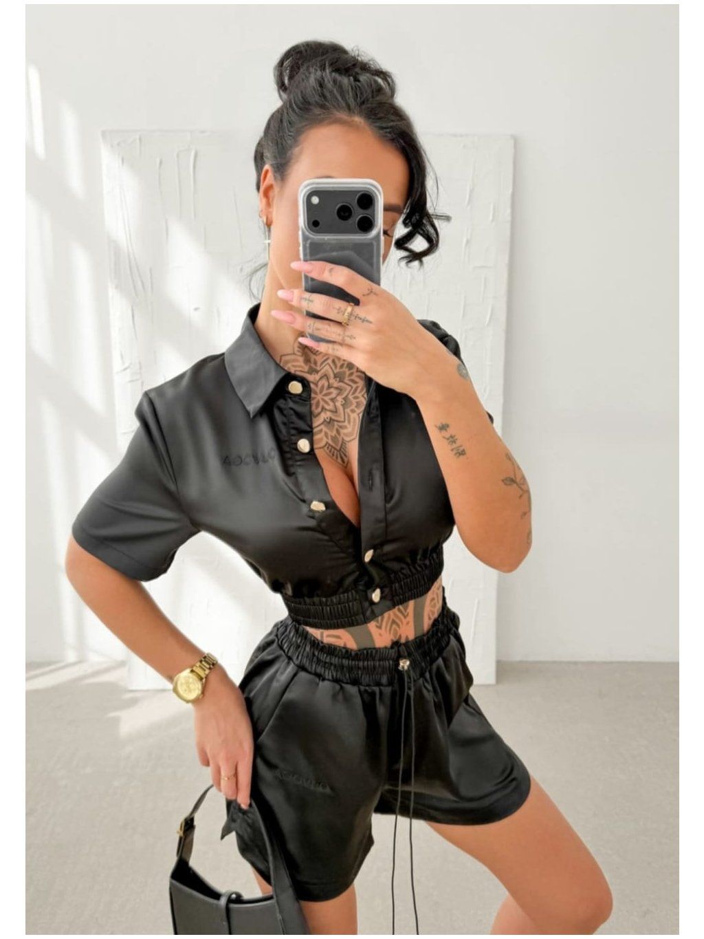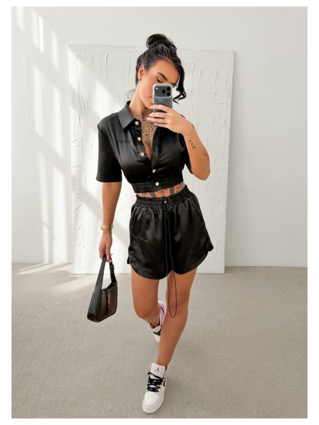 Dámsky saténový komplet ,ktorý sa skladá so skrátenej košele a šortiek.