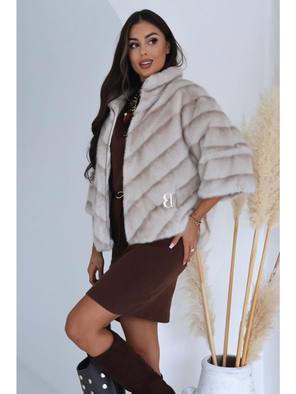 Elegantný jemný kožúštek v bledej farbe.