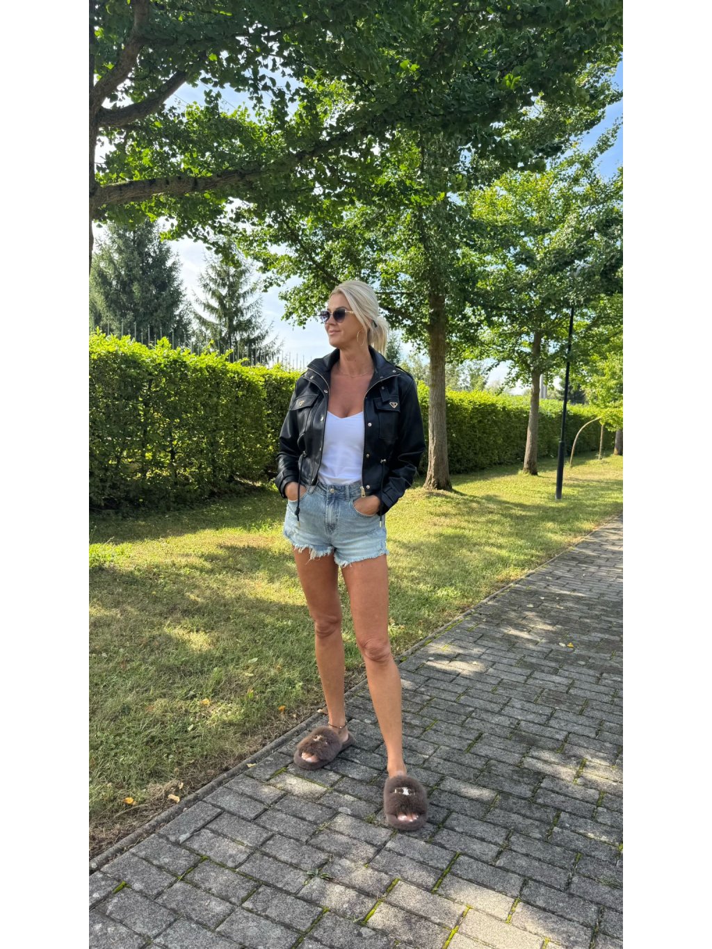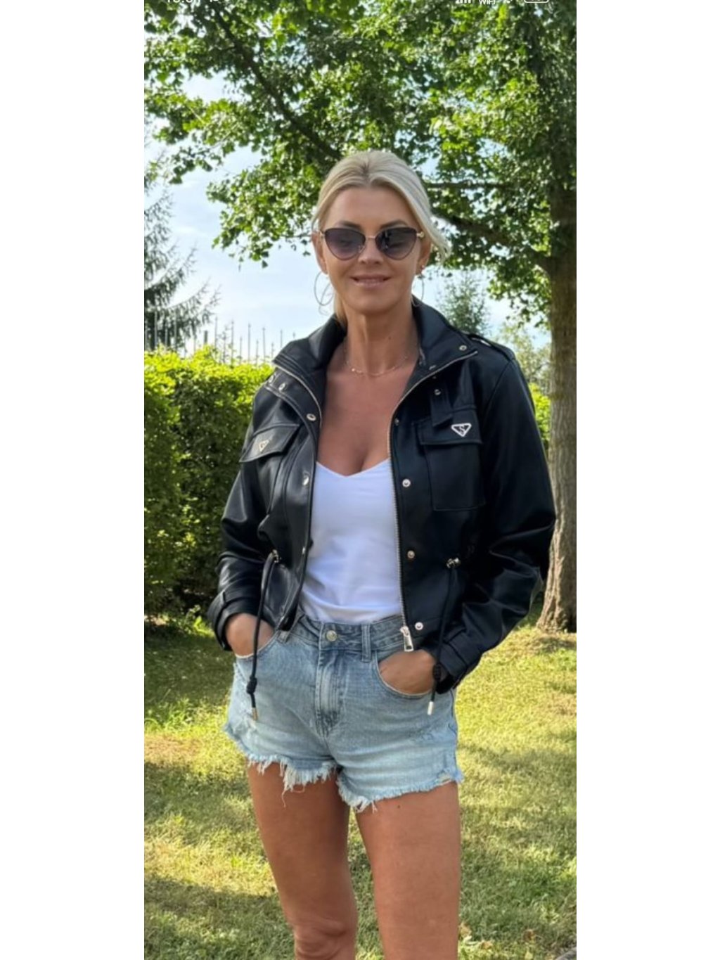 Štýlová elegantná bunda z umelej kože skráteného strihu.