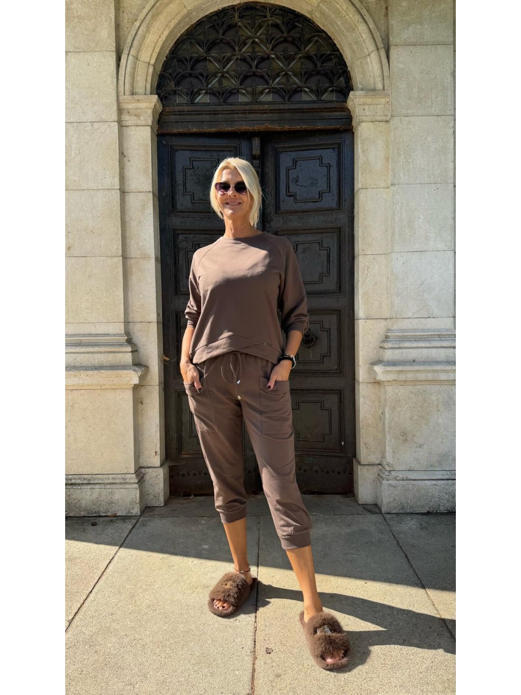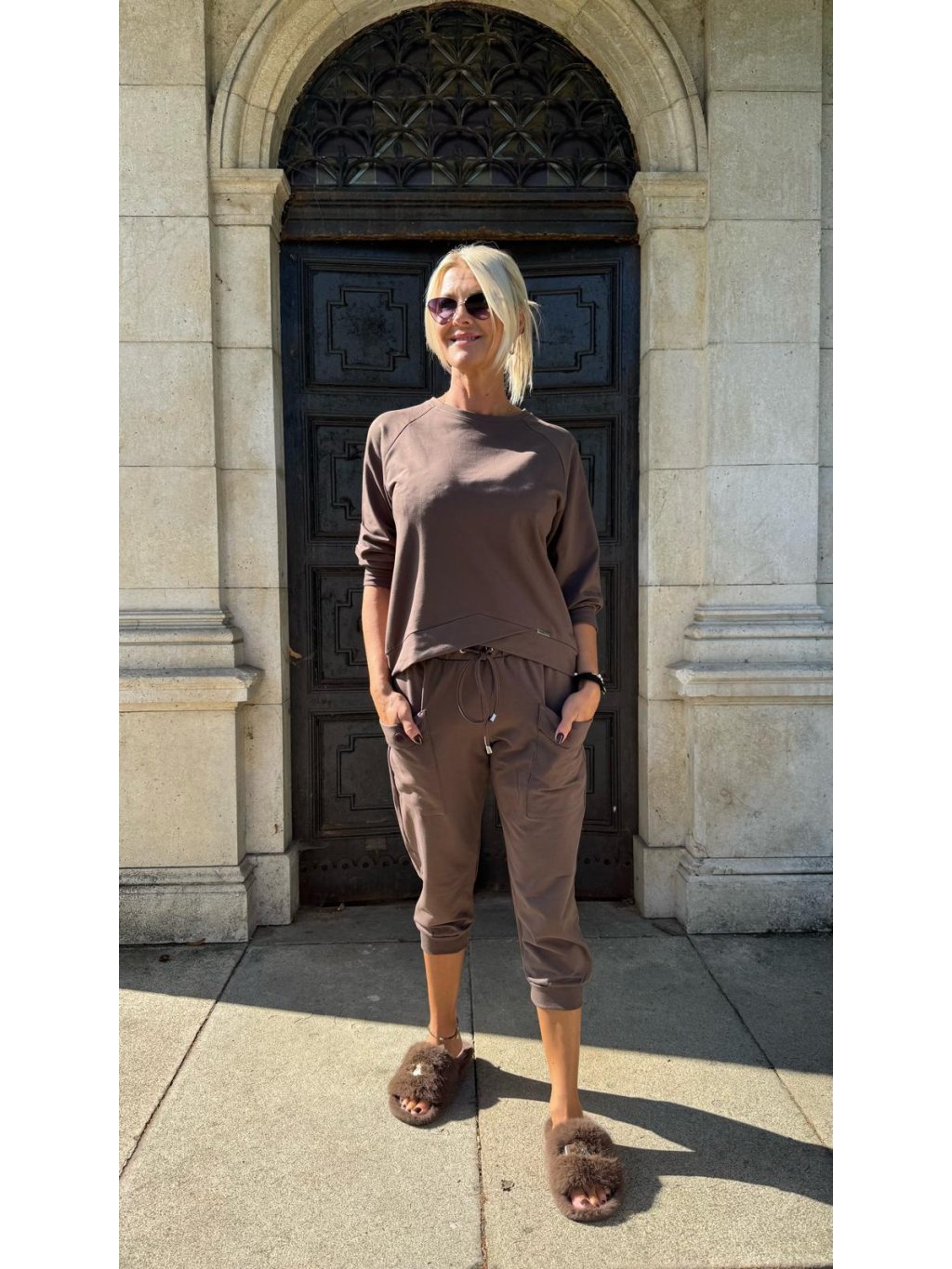 Mikina v čokoládovej farbe s raglánovými rukávmi a má volnejší strih,ktorý je pohodlný.