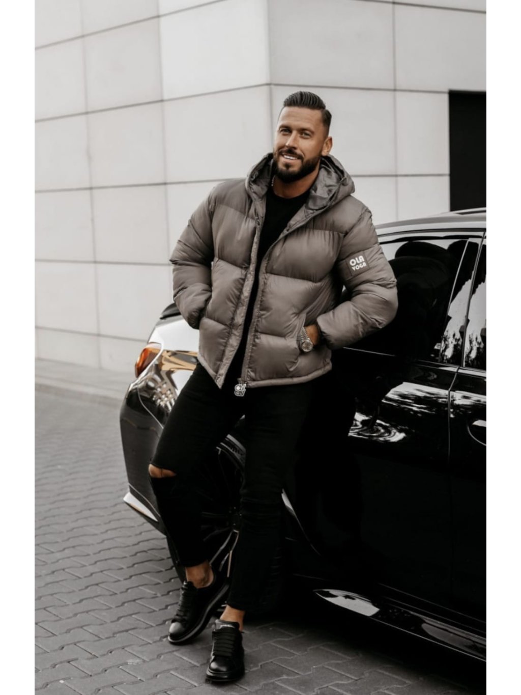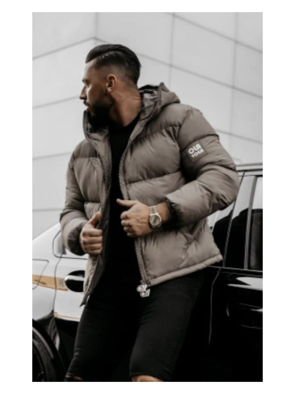 Bunda má vysoký golier s kapucňou a na rukáve nášivku OLA VOGA.