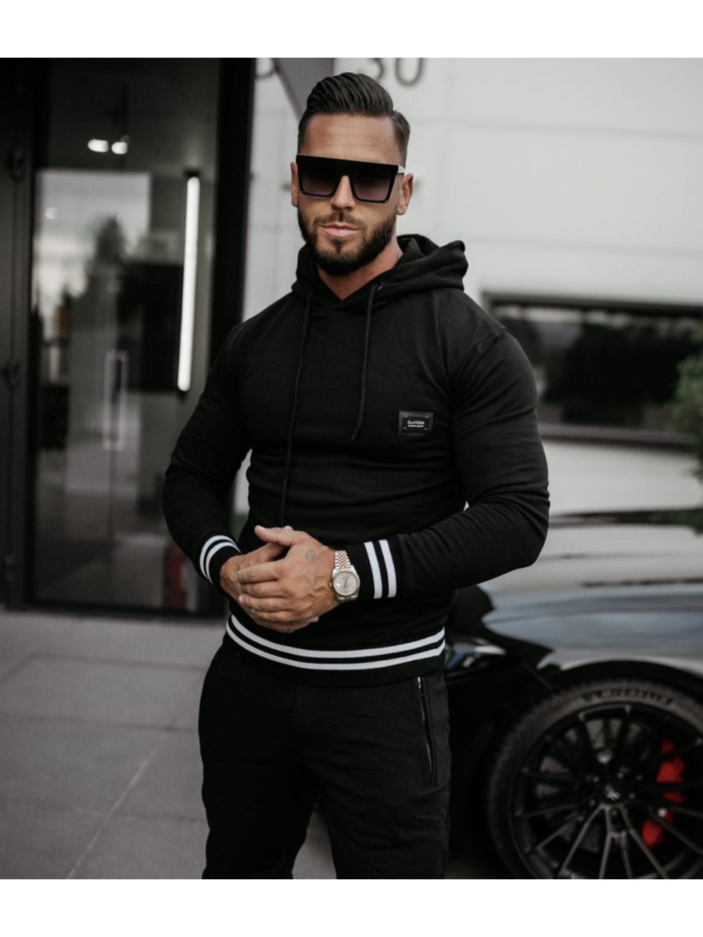 Klasická mikina s kapucňou a športové nohavice s bočnými vreckami a elastickým pásom.